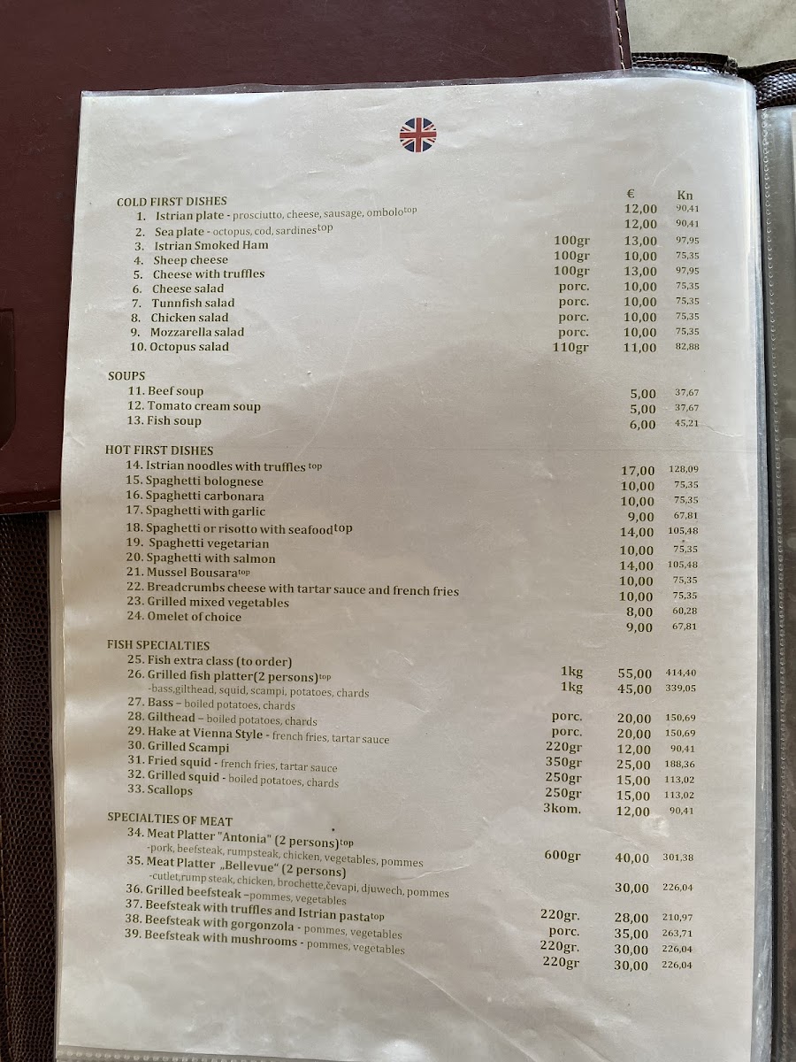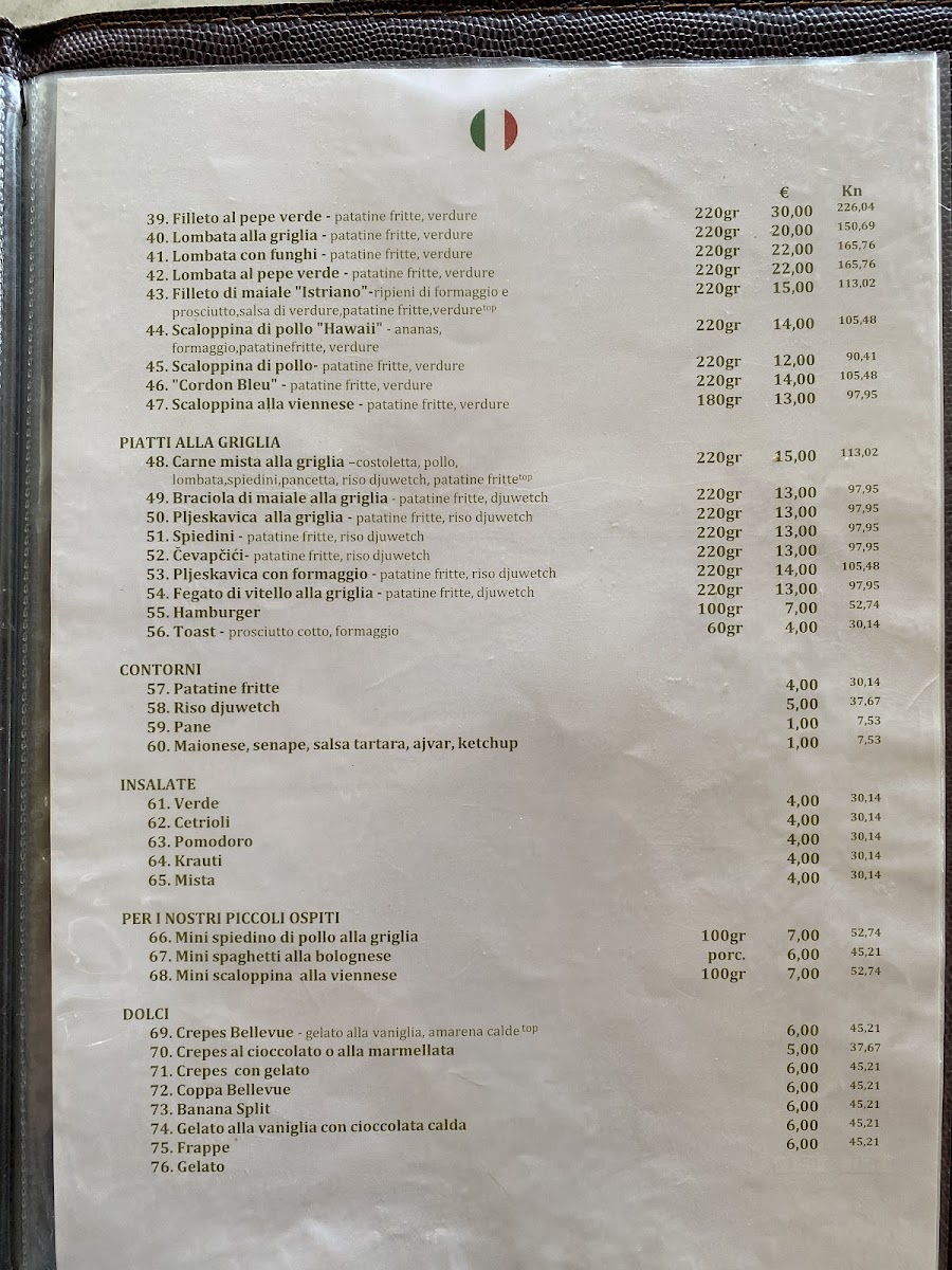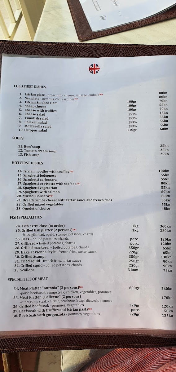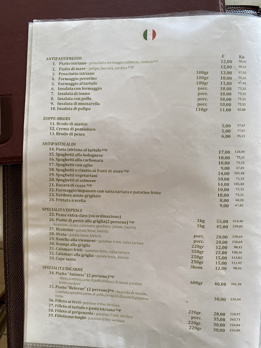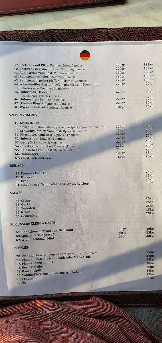 At Restoran Antonia, located in the picturesque Plava Laguna of Poreč, Croatia, the menu offers a diverse and flavorful selection that captures the essence of Mediterranean and Croatian cuisine. The Grilled Fish Platter is a highlight, offering a delicious assortment of freshly grilled fish perfect for seafood lovers. The Calamari Alla Griglia and Miesmuscheln In Weißwein are also noteworthy, each delivering a burst of oceanic flavor, with tender squid and mussels cooked to perfection. For those seeking lighter options, the Grilled Vegetables offer a healthy and flavorful accompaniment. Traditional Croatian favorites like Cevapcici, a grilled minced meat dish, and the hearty Fleischplatte Antonia, a mixed meat platter, will surely satisfy meat lovers. Those craving something uniquely tropical can try the Hähnchenbrust Hawaii, a grilled chicken breast topped with pineapple. The menu also features comforting classics like the crispy Schnitzel Wiener Art and the mixed seafood delight of Špageti Z Morskomi Sadeži In Rižota Z Morskimi Sadeži, combining spaghetti and risotto with an array of fresh seafood. For a light and crispy treat, the Fritto Misto offers a delightful mix of fried seafood. To finish on a sweet note, indulge in a refreshing Banana Split, perfect for those with a sweet tooth. Whether you're looking for fresh seafood, grilled meats, or comforting classics, Restoran Antonia offers a variety of options to satisfy every palate.
